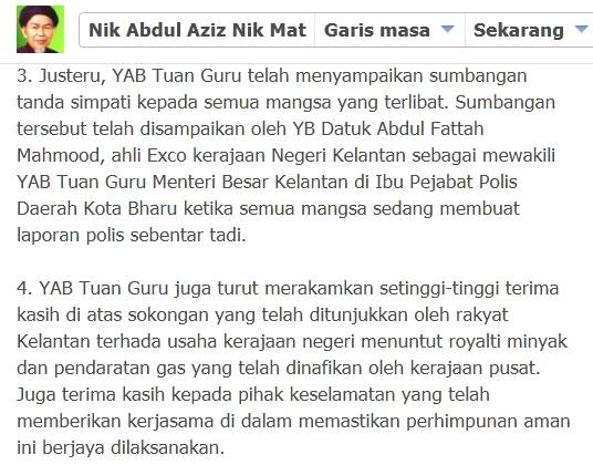 Apakah Nik Aziz tidak mengaku rakyatnya sepertimana satu ketika dulu Nik Aziz tidak akui bahawa orang Asli yang turut berdemontrasi itu benar-benar Asli. Andaikata berlakunya demontrasi sekali lagi dan menyebabkan kecederaan kepada penyokong Pas, dan ketika membawa mereka ke hospital, pihak hospital tidak menerimanya kerana mereka bukan dikalangan yang menyokong kerajaan.